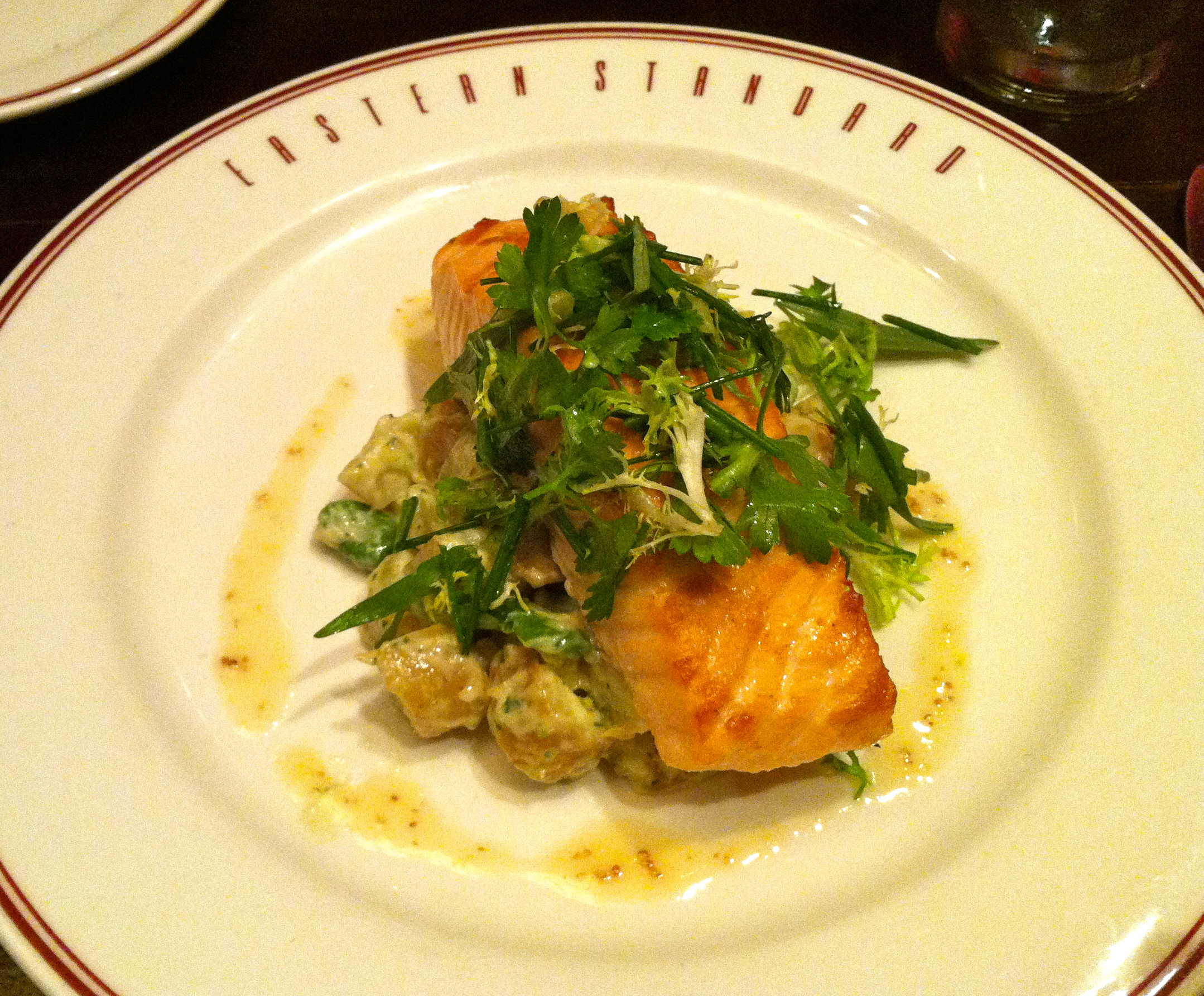 In the center of our private dining room stands an uncovered dark wood table, simply dressed with two sets of tall, curvaceous salt- and peppershakers. Alongside each of the seven place settings sits an ivory plate marked with two concentric burgundy rings and the Eastern Standard moniker at the edge. A knife and fork of heavy weight, a water glass, and a white napkin, folded around the menu card featuring the evening’s special fare, complete the setting with a restrained simplicity.