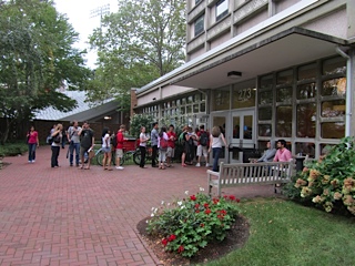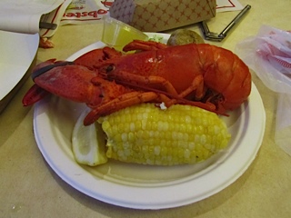 Once at the front of the line, each student exchanged a ticket for a thick paper plate of “Steamed Native Maine Lobster” from Trenton, Maine, accompanied by “Local Steamed Corn on the Cob with Local Chervil Butter” from Ward’s Berry Farm in Sharon, Massachusetts and Cabot Creamery in Cabot, Vermont, and “Baked Local Maine Potatoes” from the Maine Potato Growers Co-op in Presque Isle, Maine. Additional local items included “Grilled Local Squash and Fresh Local Dill,” “Fresh Local Apple Cider,” and “Local Peach Trifle.” The menu also featured a regionally iconic, but not locally sourced “Roasted Corn, Red Pepper and Crab Bisque.”