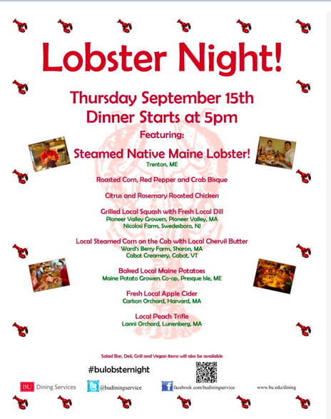 It’s that time of year again for Boston University Lobster Night. Held annually in the dining halls, Lobster Night welcomes students to campus and a new school year, with a festive New England-themed dinner. This year’s event takes place this Thursday, on September 13 in the main dining halls across campus, and is open to students and the public.