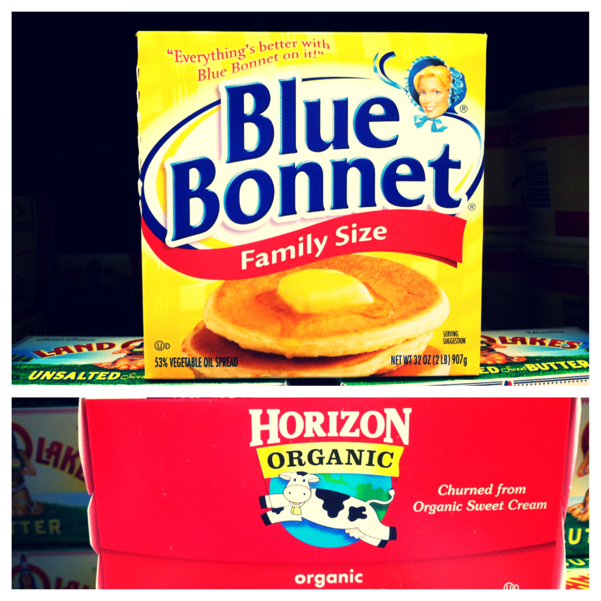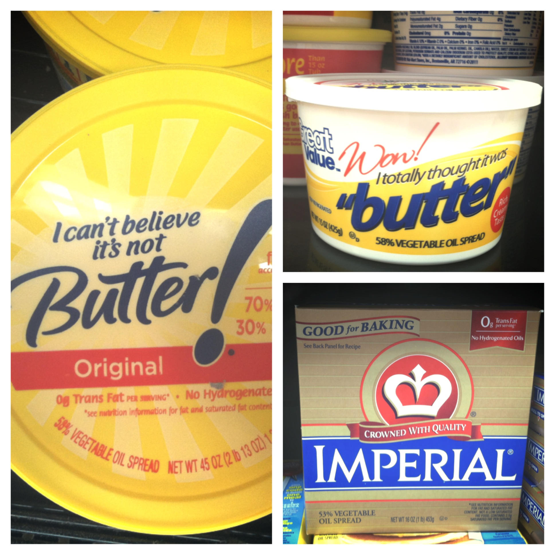 Bizarre iPhone photography sessions aside, butter bears a complicated identity in the grocery store. In her poetic ode to butter Margaret Visser (a Canadian Michael Pollan predecessor) explains the “butter mystique,” proclaiming it simple, rich, golden, and pure, as well as “irreproachable, unique, and irreplaceable” among both ancient and modern foodstuffs (chapter 3 in Much Depends on Dinner, 1986). While beyond reproach for some, heart health recommendations often shun butter for its saturated fat content, instead championing margarine, a food product with its own mixed identity, including everything from a healthy alternative to a butter impostor, a Frankenstein-esque food terror created in a lab to a cheaper spread. These layered food identities play out in the grocery store aisle, full of “real” butter, margarines, and butter-like concoctions, each exhibiting meaningful food packaging.