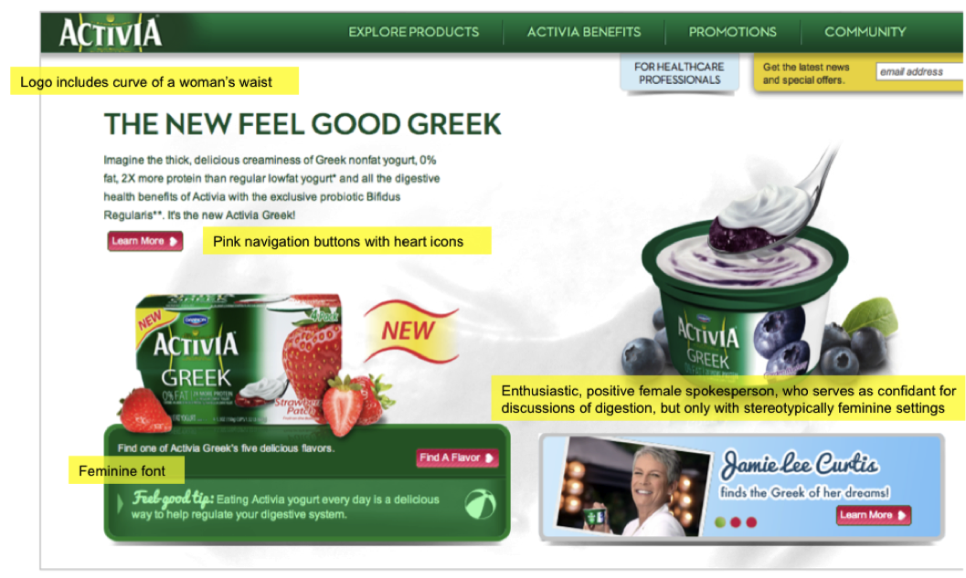 The 2013 U.S. Activia website homepage featured spokeswoman, Jame Lee Curtis, as well as feminine touches, such as pink navigation buttons, heart icons, and distinctly “girly” fonts.