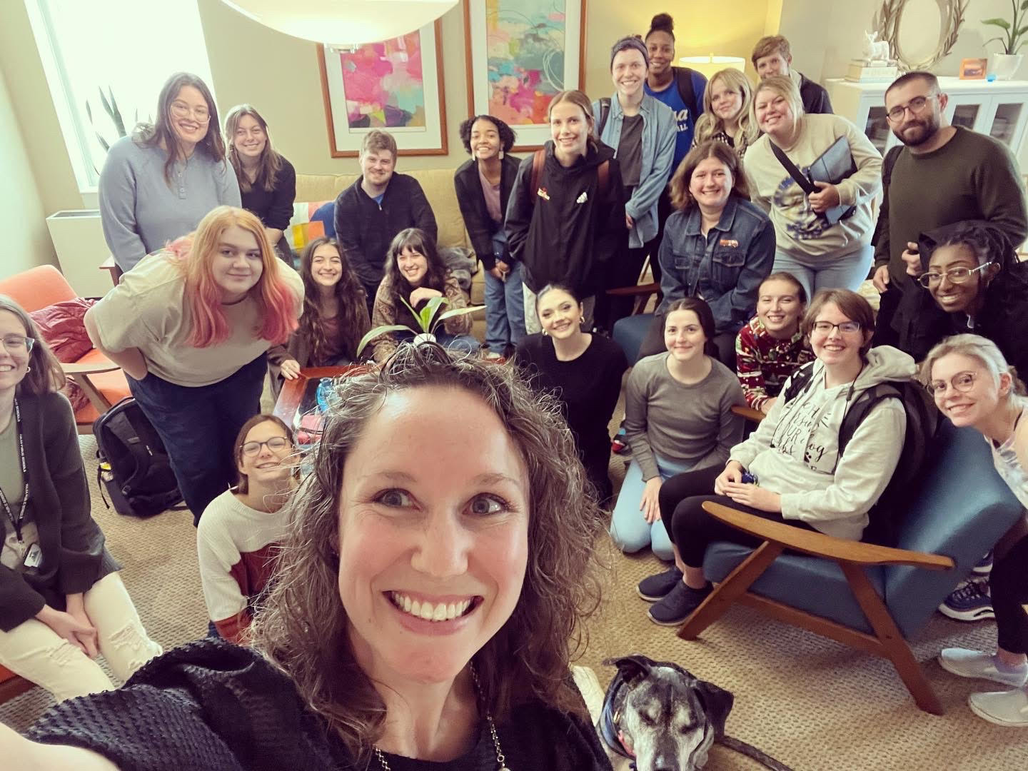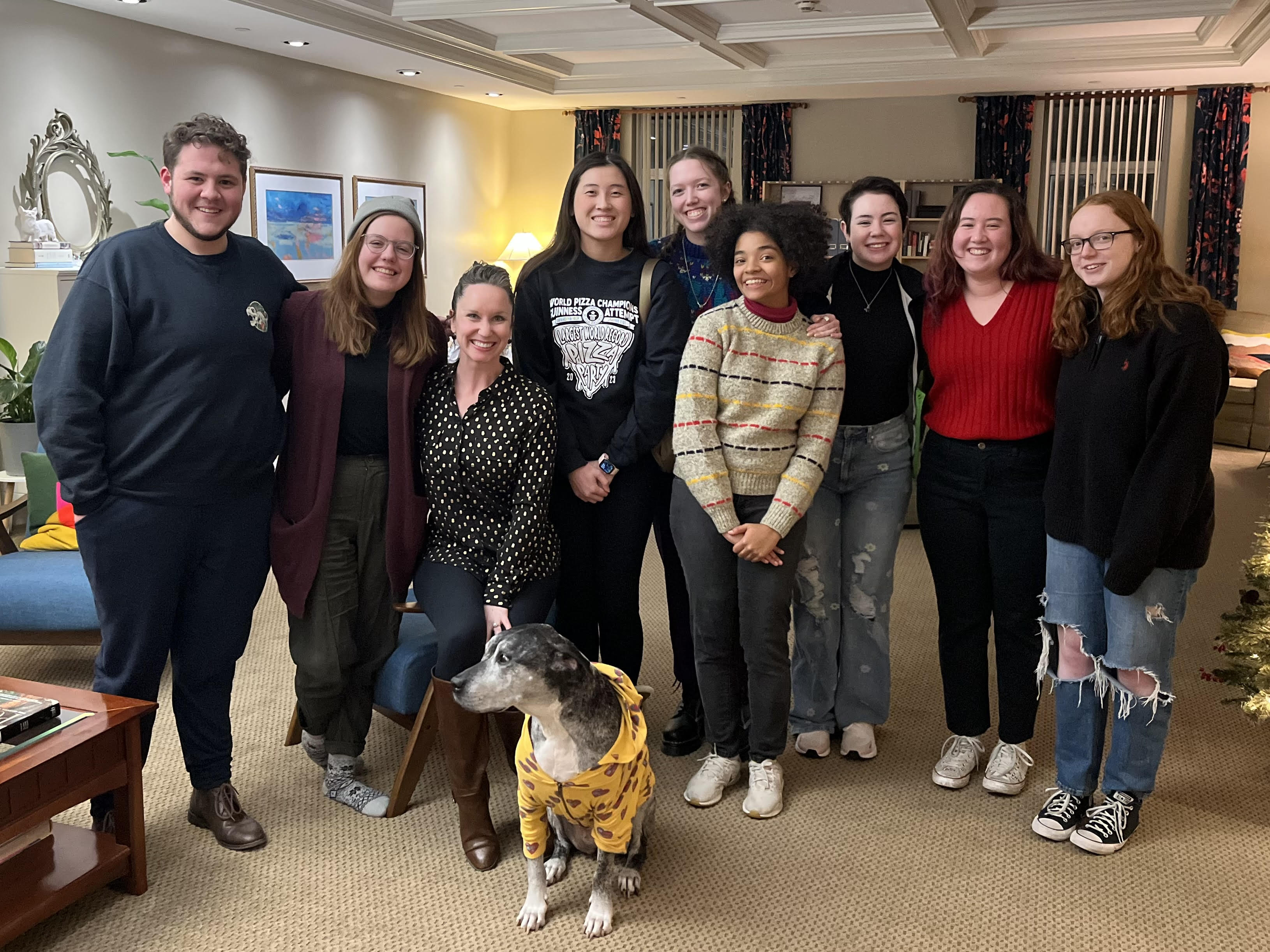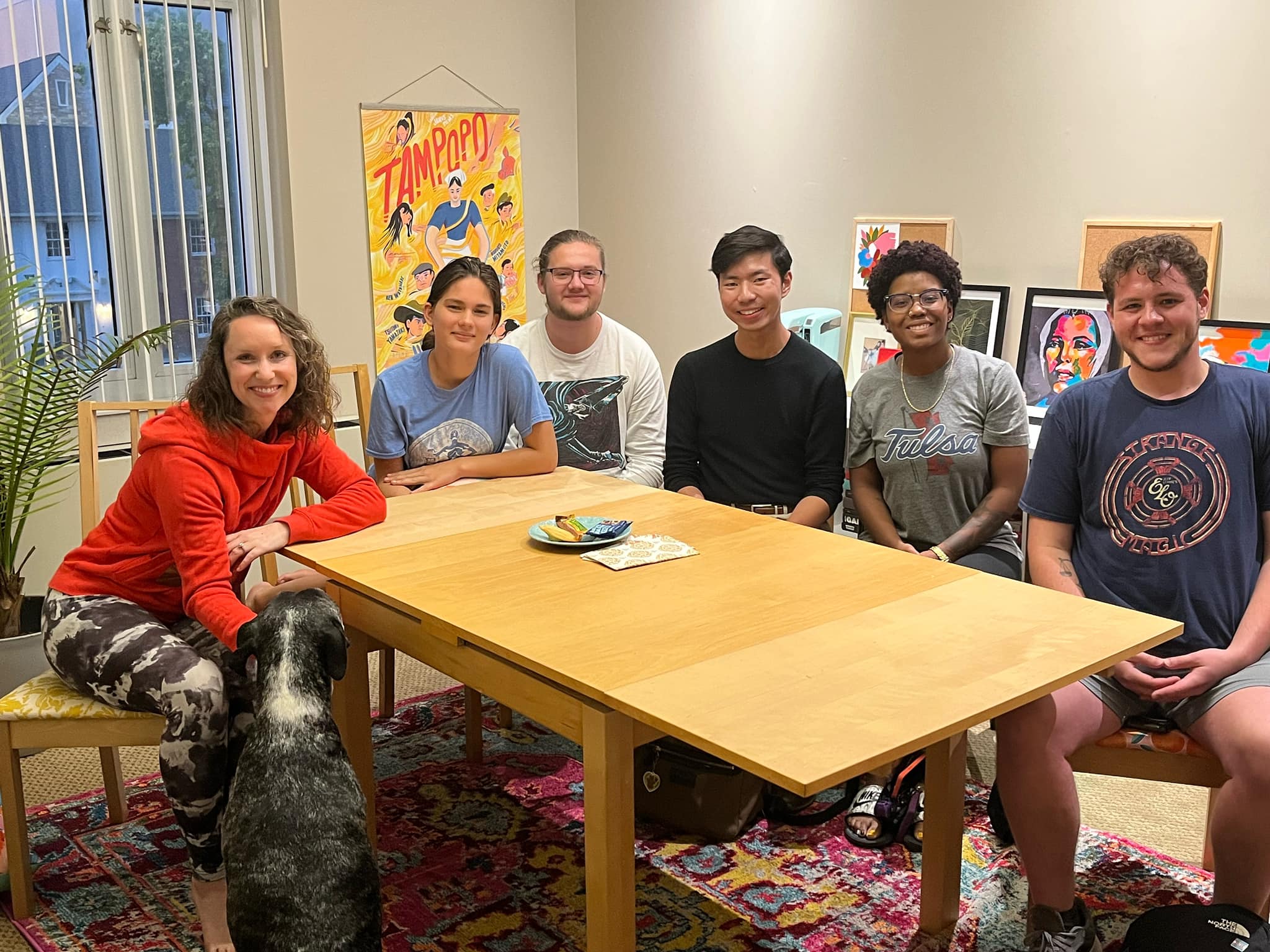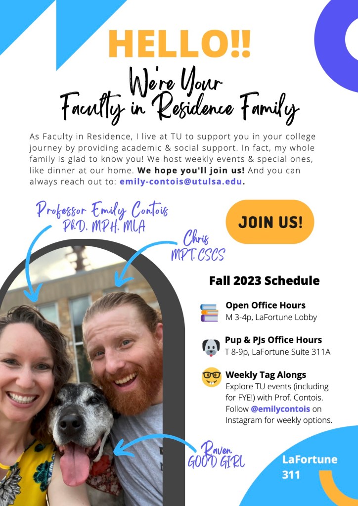 The 2024-2025 academic year marked the third in my (Emily Contois, Associate Professor of Media Studies) Faculty in Residence (FiR) journey at The University of Tulsa, along with my husband, Chris, and our dog, Ruby. Over these three years, we’ve hosted 115 events in our home and participated in many more across campus. We’ve continued successful FiR programming from our first year—including weekly office hours, Pup & PJs evening events, and monthly dinners at our home—and built upon successes from our second-year—including academic skills workshops and social events that merged my teaching and FiR work.