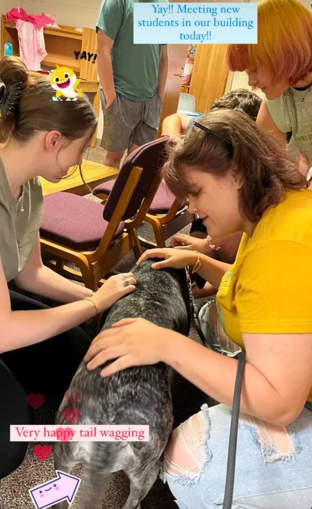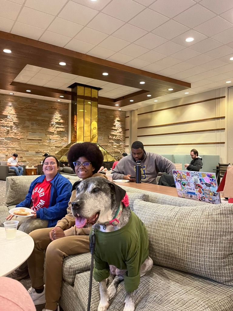 A LaFortune Lobby Office Hour took place weekly for students to stop by for academic and social help, or just to chat, co-work, or pet Ruby. Lobby hours also facilitated informal interactions with LaFortune residents as they passed through the space, like Heide Renteria, a first year student studying Elementary Education with a minor in Spanish, who writes,