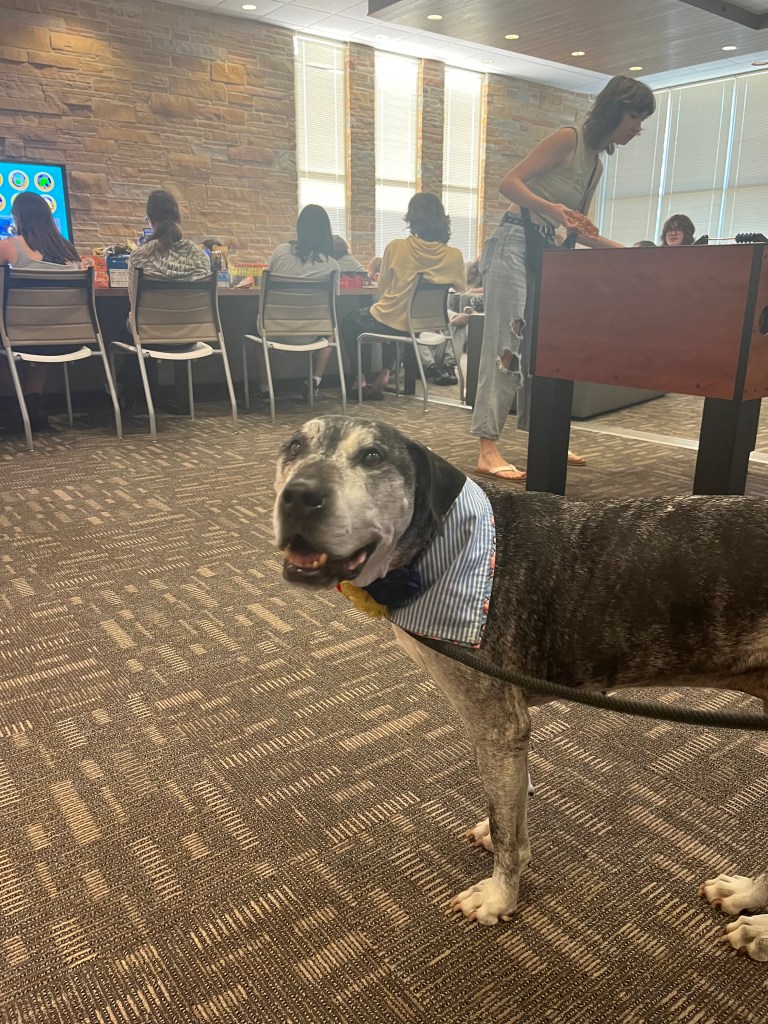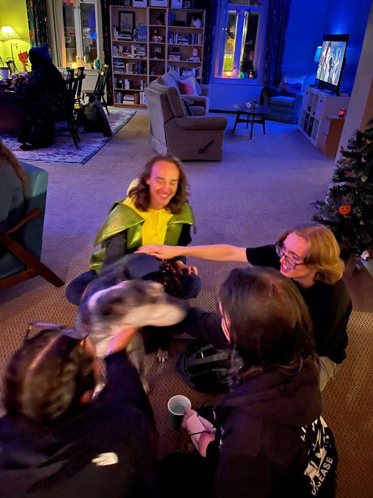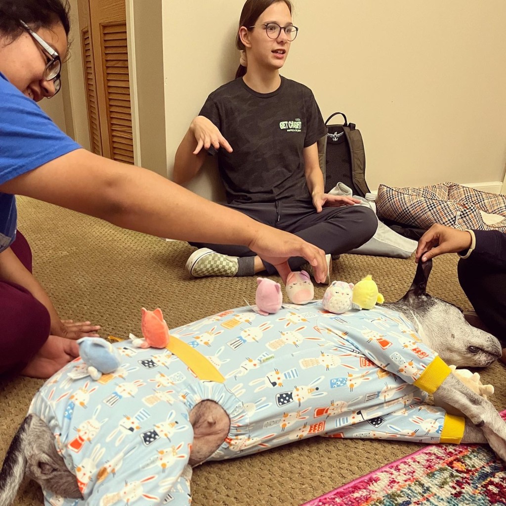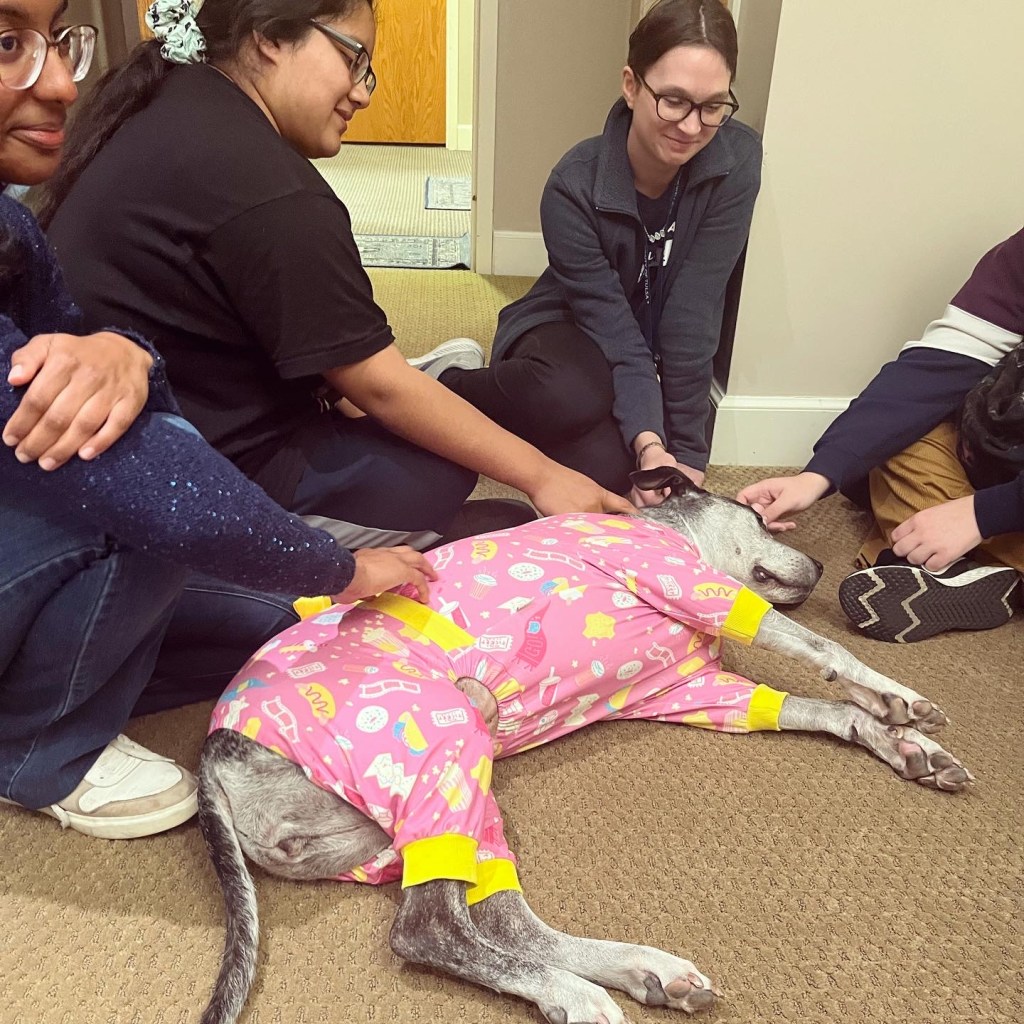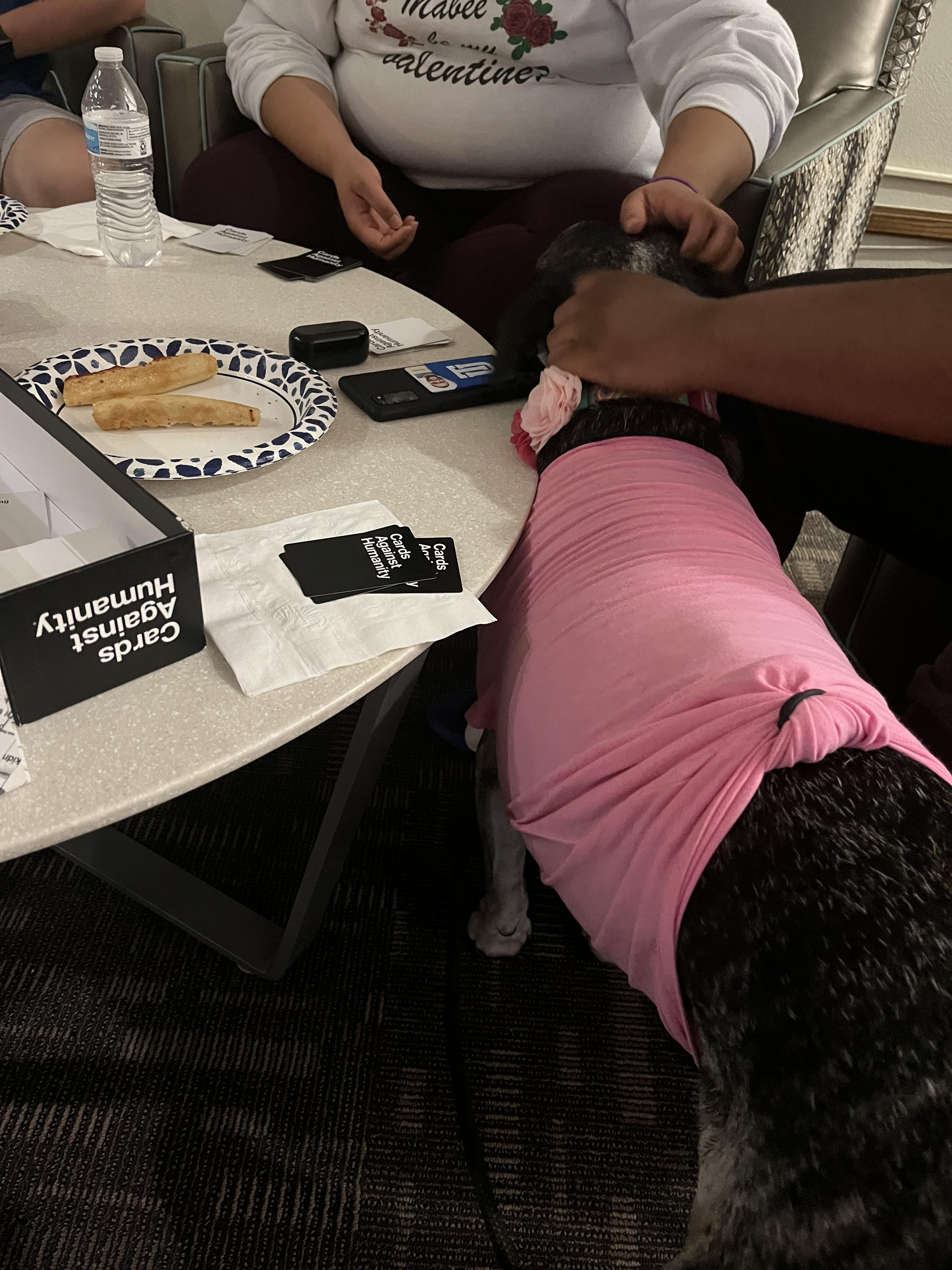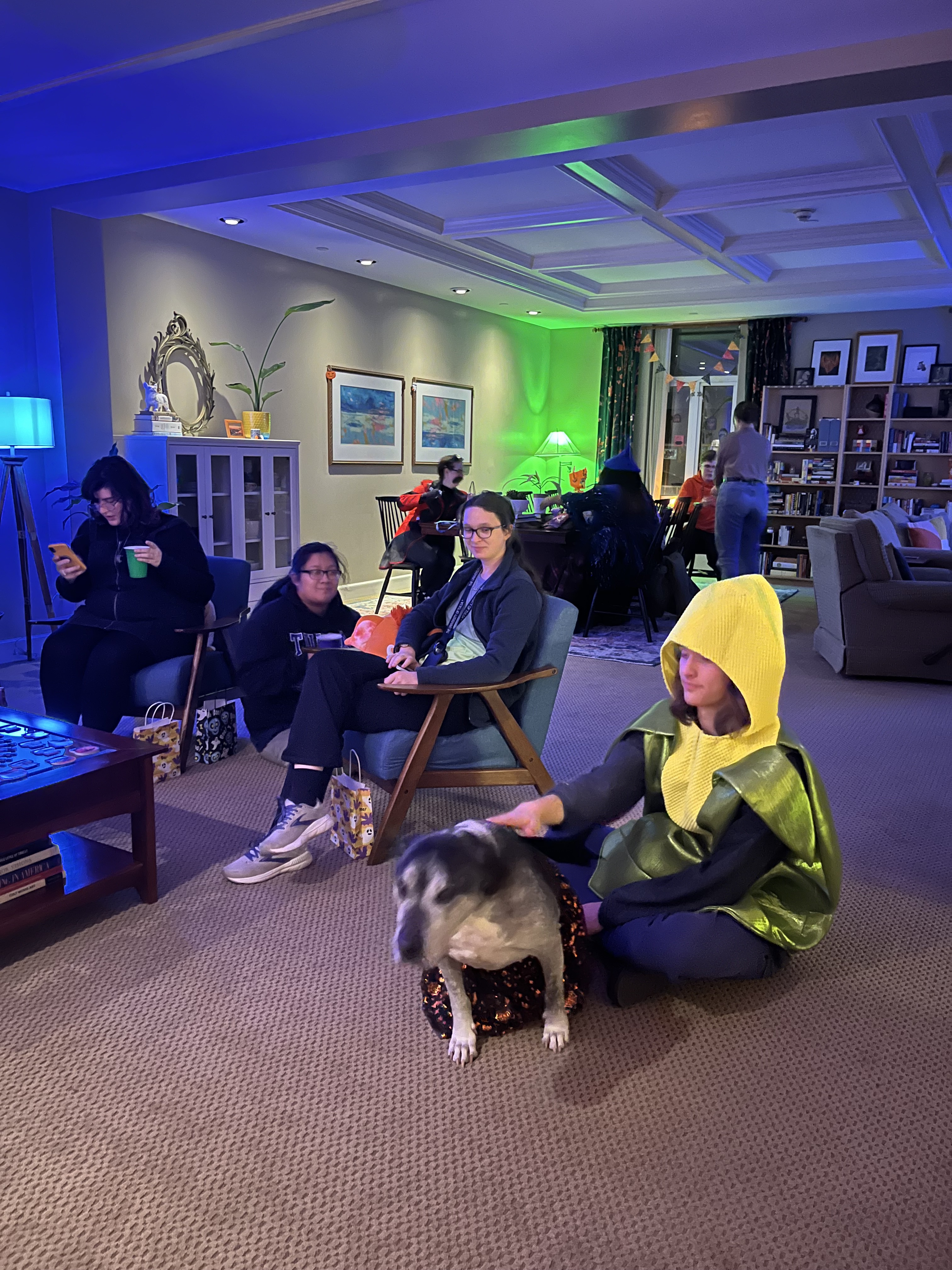 Pup & PJs were able to return after we adopted Ruby. Typically, students would join us for an hour in the evening to pet and play with her and talk about how they’re doing. A few times, we expanded the event beyond pup social time. One night we watched and discussed the Vice Presidential Debate. On another, we watched episodes of Pop Culture Jeopardy. Election Night 2024 also fell during a Pup & PJs event, so we invited students to experience the culmination of their first voting experience in community and in a nurturing environment.