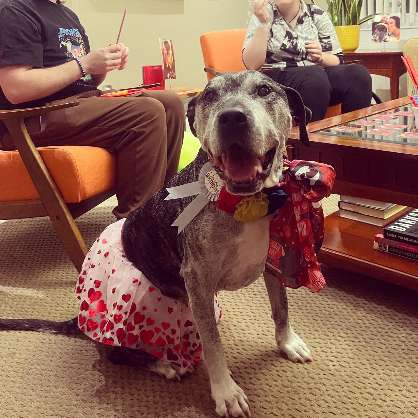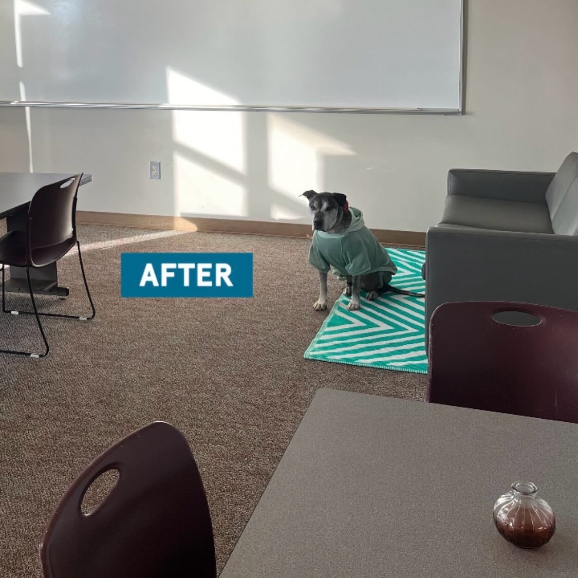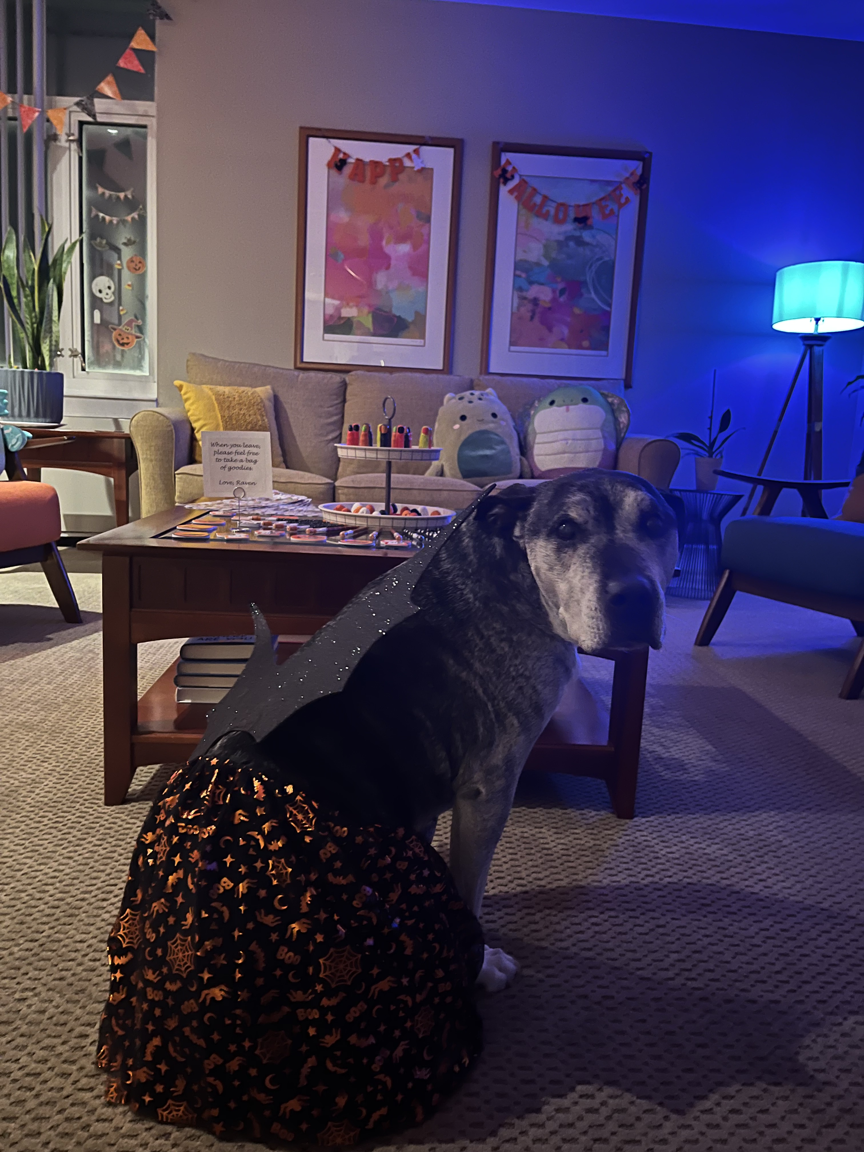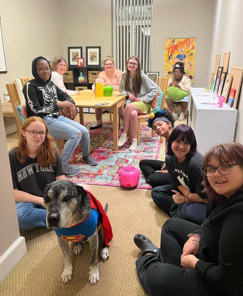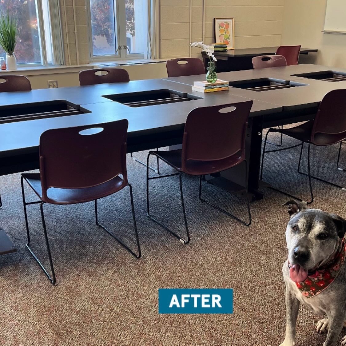 Pup & PJs were able to return after we adopted Ruby. Typically, students would join us for an hour in the evening to pet and play with her and talk about how they’re doing. A few times, we expanded the event beyond pup social time. One night we watched and discussed the Vice Presidential Debate. On another, we watched episodes of Pop Culture Jeopardy. Election Night 2024 also fell during a Pup & PJs event, so we invited students to experience the culmination of their first voting experience in community and in a nurturing environment.