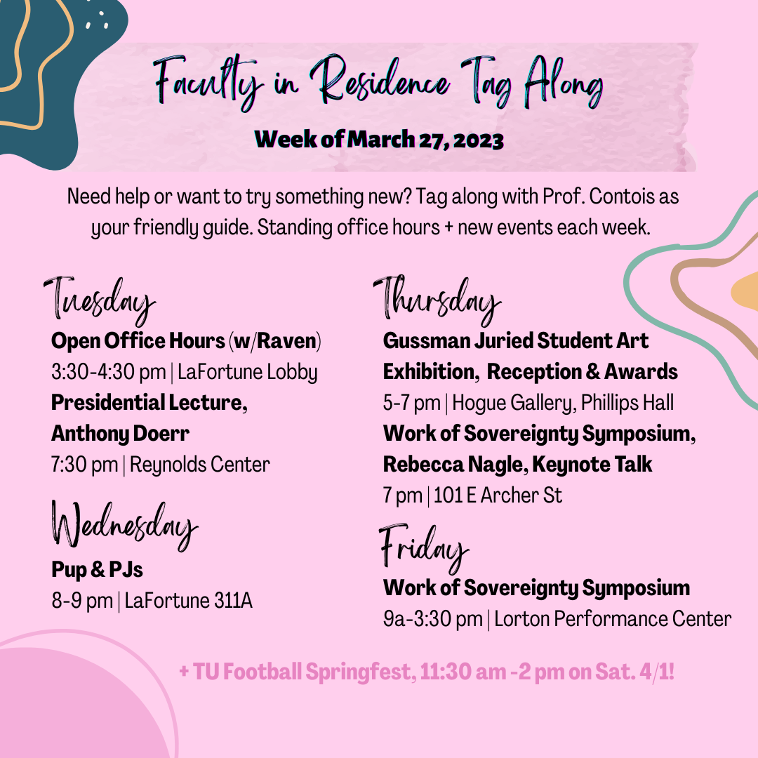 I absolutely love the Faculty in Residence program. I have been going to Professor Contois’s events since her first semester in the role. I have loved getting to know one of my favorite professors in a more personal way that allowed me to see her as more than just a faculty member. I have attended many of her events including dinners, finals study preparations, and my personal favorite: Pup n’ PJs. Faculty in Residence has been my favorite program TU offers and I hope to see it continue.