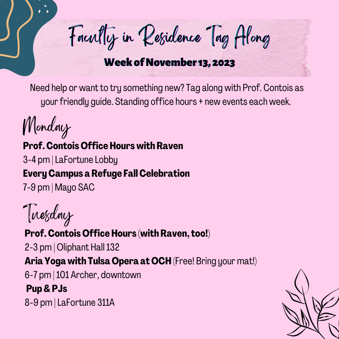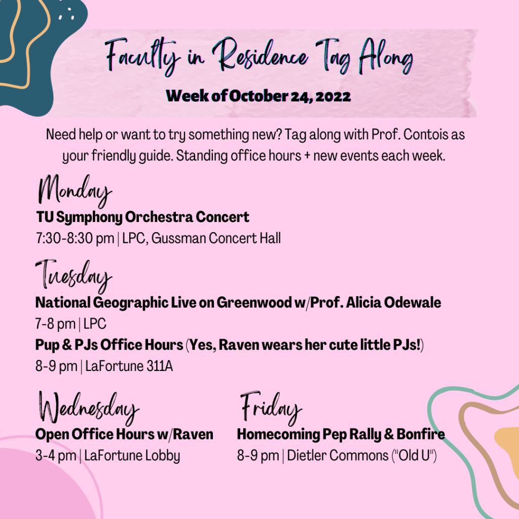 I’ve gone to MANY Faculty in Residence events over the years. Some of my favorites have been Pups and PJs and the study event in which Professor Contois provided us with fresh baked cookies are we prepared for our midterms. I truly enjoy going to events because Professor Contois is so welcoming and shows up for her students not just in the classroom but outside as well. She truly cares about her students, and it shows by the special events that she puts on throughout the semesters. Going to her events has made my time at TU even more special and the events, as well as Professor Contois, will be something I miss once I graduate. Thanks for everything you’ve done for me over my 4 years at TU!