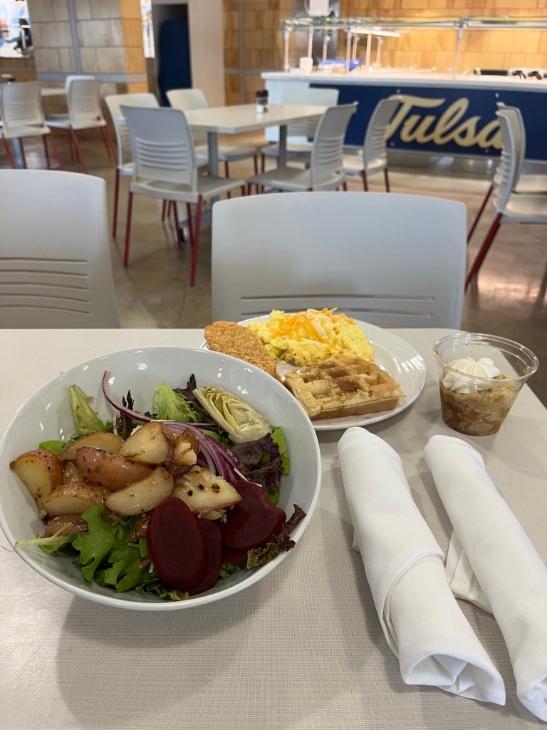 UTulsa Dining. I interacted with students (as well as faculty and staff friends) multiple times a week at Pate Case Dining Center, the Union food court, and the McFarlin Library Starbucks. Given my evening teaching schedule in Spring 2025, I ate dinner with students every Monday at 5 pm.