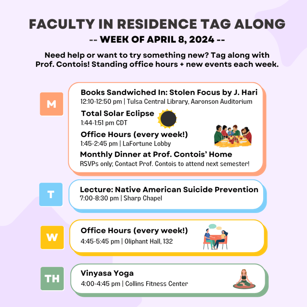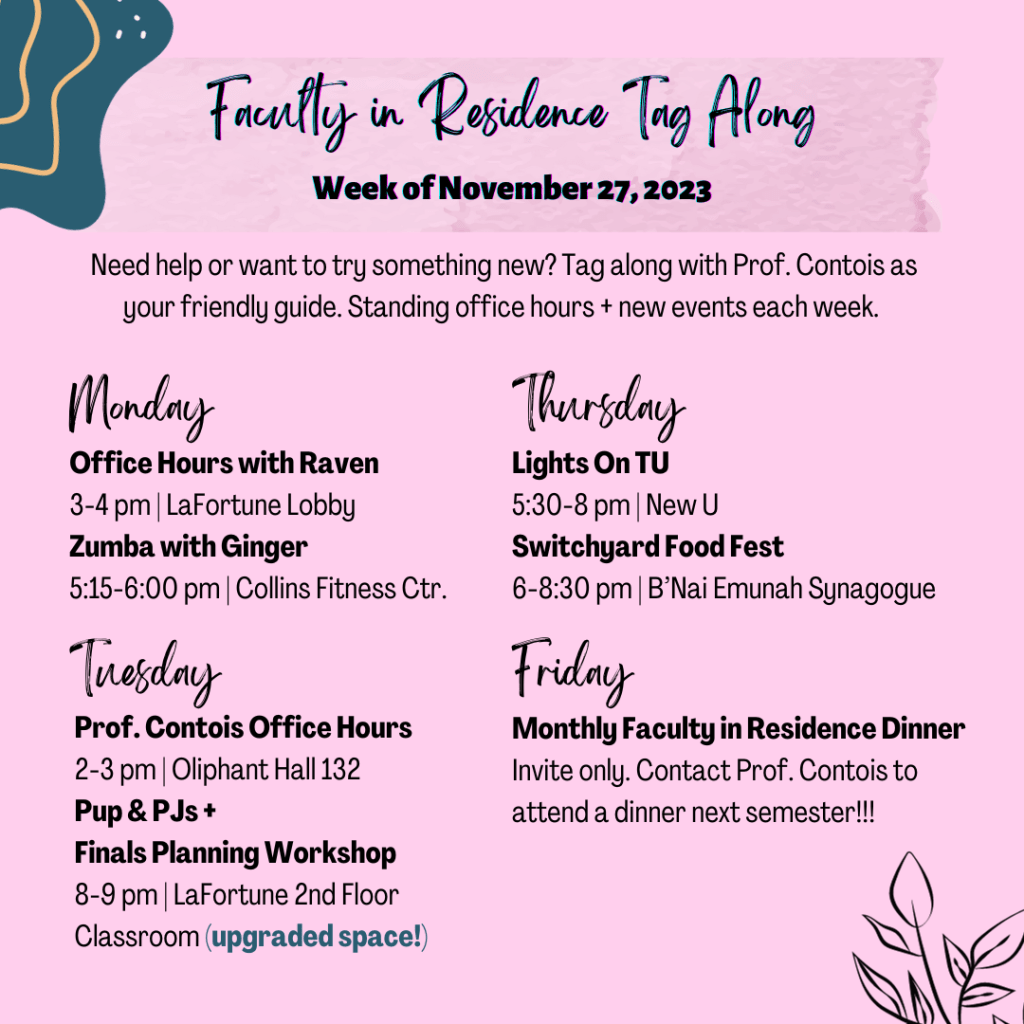During this past year, I lived in LaFortune, so I had Faculty in Residence right there! It was nice to interact with Professor Contois and her family. I participated in the Faculty Dinner, a finals workshop, many office hours in LaFortune, along with many Pups and PJs. Throughout these events, I managed to meet and learn from many other students here at TU, along with good tips that will follow me throughout college.