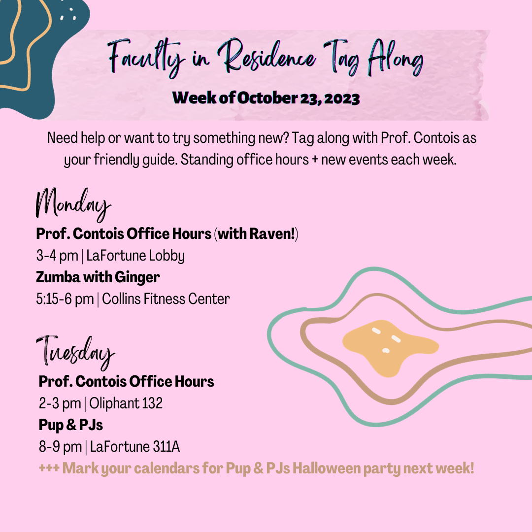 I attended Professor Contois’ Pup & PJ events, her final study sessions, and one of the dinners hosted in her home. These events and seeing her and Ruby around campus and the dorm helped LaFortune feel like home. Seeing the notes she would leave on doors during final weeks and knowing she was a resource if I needed her made the transition to college so much easier!